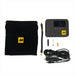 3 valve adaptors, USB charging cable, 12v cigarette lighter cable and storage bag included